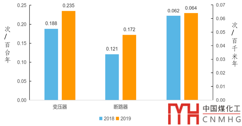 2019年,架空線路、變壓器、斷路器三類(lèi)主要設(shè)施的強(qiáng)迫停運(yùn)率分別為0.064次/百千米年、0.235次/百臺(tái)年、0.172次/百臺(tái)年,同比分別增加0.002次/百千米年、0.047次/百臺(tái)年、0.051次/百臺(tái)年。