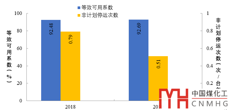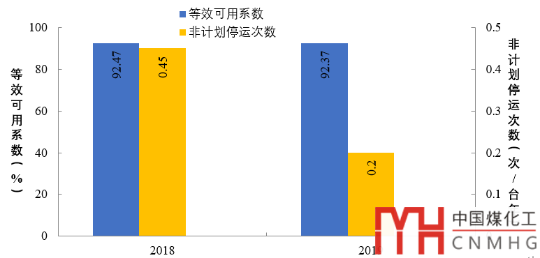 圖1 2018、2019年100萬(wàn)千瓦等級(jí)燃煤機(jī)組主要可靠性運(yùn)行指標(biāo)