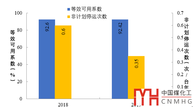 圖2 2018、2019年60萬(wàn)千瓦等級(jí)燃煤機(jī)組主要可靠性運(yùn)行指標(biāo)
