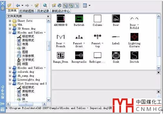 設(shè)計(jì)中心有幾個(gè)選項(xiàng)卡,常用的是前面兩個(gè):文件夾和打開文件。在文件夾選項(xiàng)卡可以瀏覽任意可以訪問(wèn)的DWGDXF文件,打開文件就是指當(dāng)前CAD已經(jīng)打開的文件,我們下面以文件夾為例。