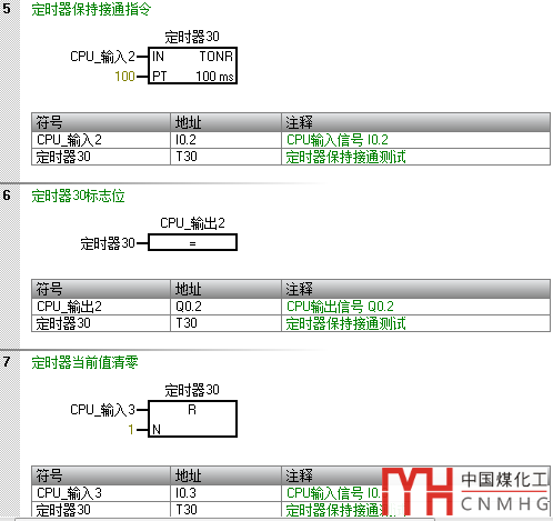 代碼段5中,當(dāng)CPU_輸入2(I0.2)的值從0變?yōu)?時(shí),定時(shí)器30(T30)開始計(jì)時(shí);在計(jì)時(shí)過程中,若CPU_輸入2的值從1變?yōu)?,則定時(shí)器30停止計(jì)時(shí)并保持當(dāng)前的計(jì)數(shù)時(shí)間值;當(dāng)CPU_輸入2的值再次從0變?yōu)?時(shí),定時(shí)器30繼續(xù)從之前保存的時(shí)間值開始計(jì)時(shí);當(dāng)?shù)竭_(dá)預(yù)設(shè)時(shí)間10s(100x100ms)后,定時(shí)器30的標(biāo)志位被置1;