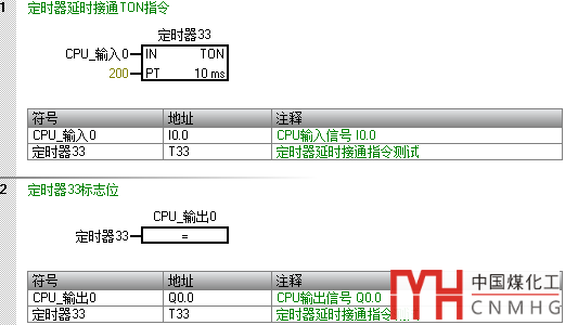 代碼段1中,當(dāng)CPU_輸入0(I0.0)從0變?yōu)?時(shí),定時(shí)器33開始計(jì)時(shí);CPU_輸入0的值保持為1,在2s(200x10 ms)后,定時(shí)器達(dá)到預(yù)設(shè)時(shí)間,此時(shí)T33標(biāo)志位被置1;