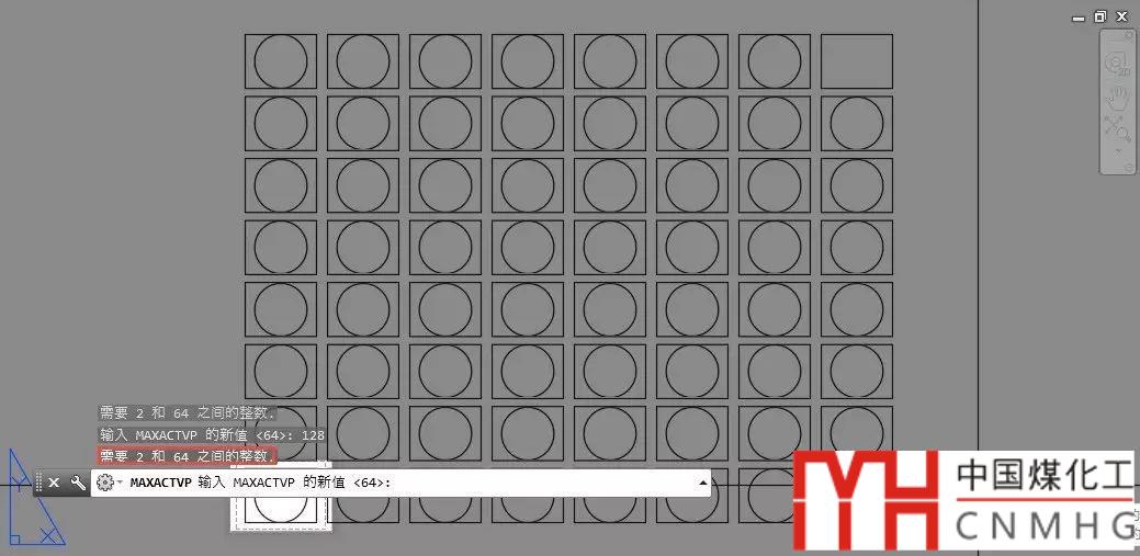 我們可以看到右上角的視口顯示空白了,從此我們也知道CAD中最多可以顯示63個視口。如果我們的布局中有視口顯示空白,我們就需要檢查一下我們的視口是不是太多了。有時看到某些圖紙的布局中視口并沒有那么多,但仍有視口沒有顯示,原因通常是類似的,只是人為修改了激活視口數(shù)量的限制。