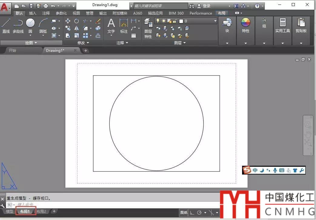為了加快操作速度,我們建立一張最簡單的圖紙,在空圖的模型空間畫一個圓,然后切換到布局空間,布局空間默認(rèn)有一個視口,如圖所示。