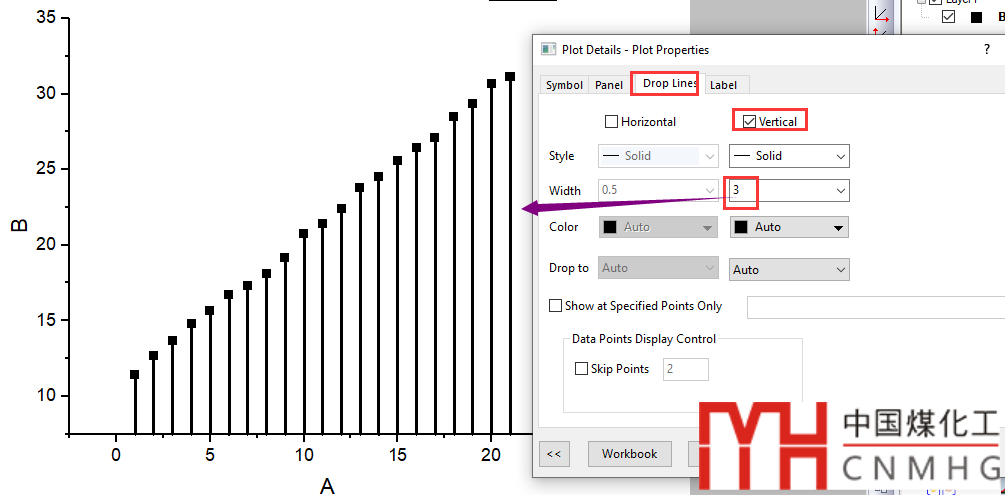 雙擊圖形,打開Plot Properties對話框,切換到Drop Line頁面,勾選Vertical,同時設(shè)置垂線的格式。