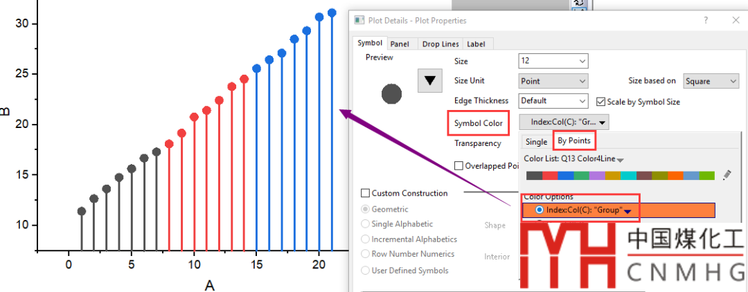 對于分組填色,可以使用Symbol Color下的By Points,Color Options里選為Indexed,數(shù)據(jù)選為輔助列,即Col(C): Group。