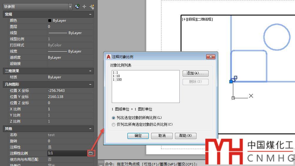 在設(shè)置注釋性后我們通常不必再去設(shè)置圖塊的比例,只需要在注釋性比例列表中添加跟視口比例匹配的比例,在視口中就會適應(yīng)比例自動調(diào)整。可以在特性面板或輸入OBJECTSCALE命令來設(shè)置注釋性比例,如下圖所示。