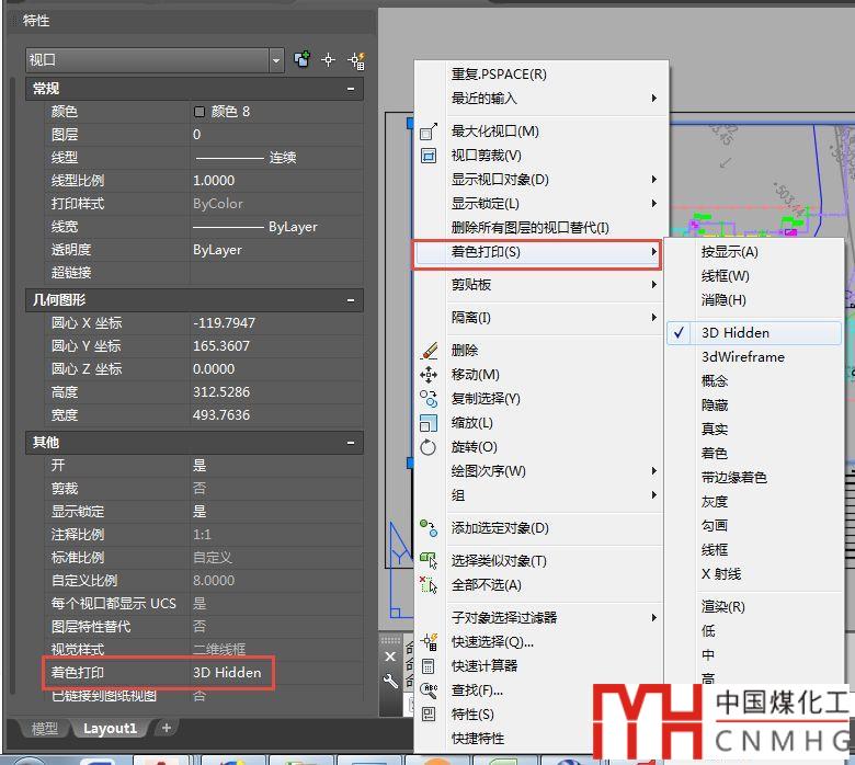 在布局中雙擊進入視口,可以看到布局里的視覺樣式是二維線框,也沒有問題。選中視口后,在特性面板(CTRL+1)中終于找到了問題所在,原來視口設(shè)置了著色打印的樣式,在特性面板和右鍵菜單都可以修改這個設(shè)置,如下圖所示。
