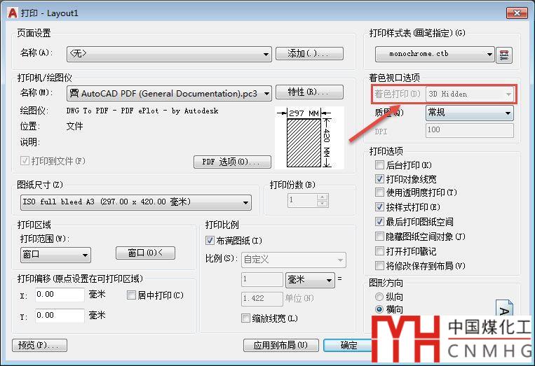 圖紙發(fā)過來后,先檢查了一下圖層和圖形的顏色設(shè)置,很正常,然后打開打印對話框,發(fā)現(xiàn)了問題,著色打印選項被設(shè)置成了3D HIDDEN,而且還不能修改,如下圖所示。