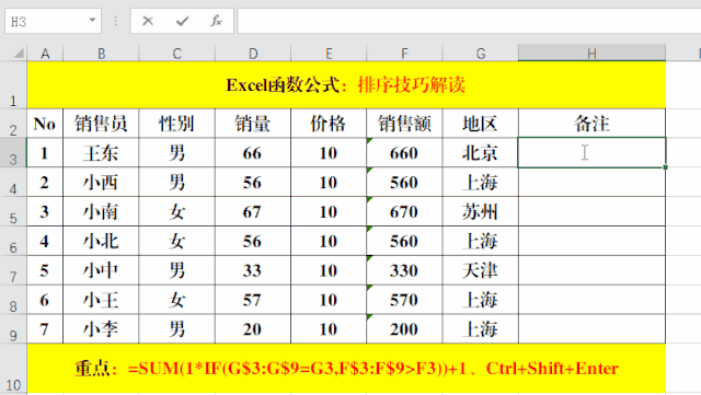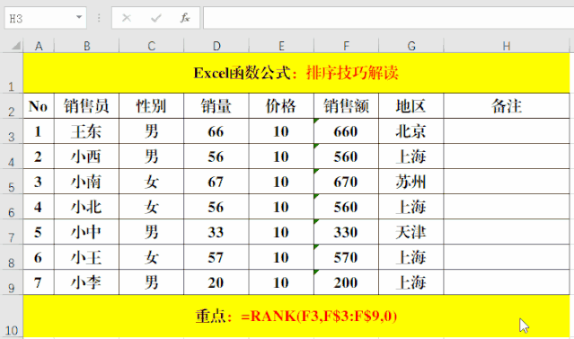 2、對每個銷售額而言,排序的范圍都是固定的,所以數(shù)據(jù)范圍(F3:F9)要用絕對引用或混合引用。