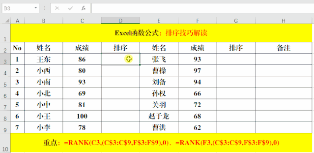 1、在第一個目標區(qū)域中輸入公式:=RANK(C3,(C$3:C$9,F$3:F$9),0)。