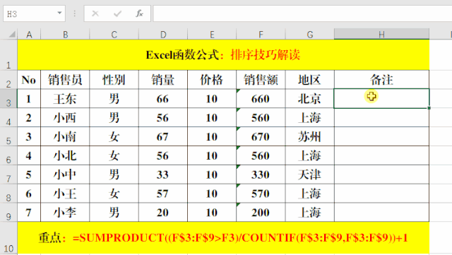 在目標單元格中輸入公式:=SUMPRODUCT((F$3:F$9>F3)/COUNTIF(F$3:F$9,F$3:F$9))+1。