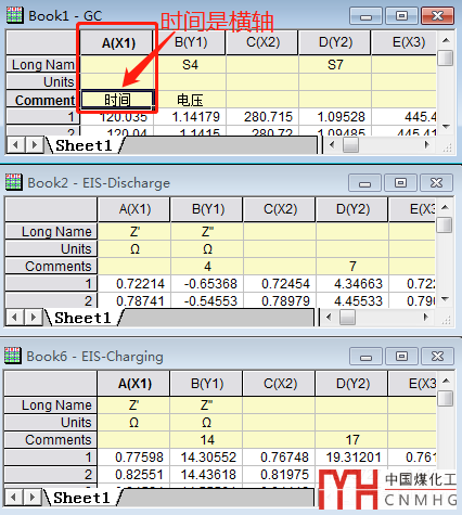 (2)數(shù)據(jù)表中一定要將X設(shè)置對(duì),對(duì)于拷貝到Origin的表中的數(shù)據(jù),一般情況下都是第一列為X,而后面各列是Y。因此需要將每組EIS的兩列數(shù)據(jù)的第一列set as X。