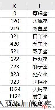 =VLOOKUP(MID(A2,11,4)*1,{0,"摩羯座";120,"水瓶座";219,"雙魚座";321,"白羊座";420,"金牛座";521,"雙子座";622,"巨蟹座";723,"獅子座";823,"處女座";923,"天秤座";1024,"天蝎座";1123,"射手座";1222,"摩羯座"},2,1)