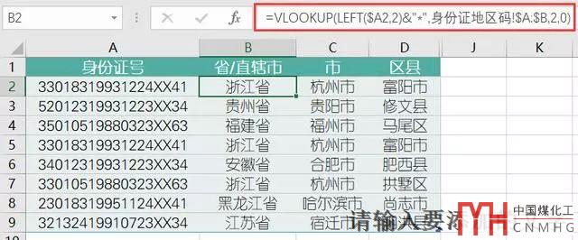 然后我們對A列的身份證號進(jìn)行提取數(shù)字,然后進(jìn)行查找匹配地區(qū)表