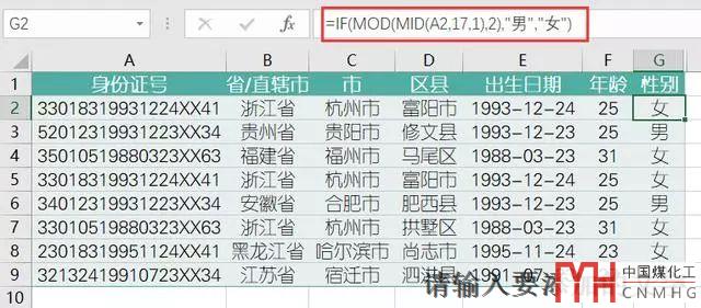 身份證號的倒數(shù)第2位,也就是第17位,如果是奇數(shù),那么為男性,如果為偶數(shù),則為女性,所以在G2單元格中輸入公式:
