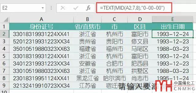 身份證號的第7位至第13位是表格出生的年月日,在E2單元格中輸入公式: