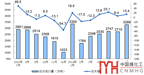 7月份,進口煤炭3289萬噸,同比增長13.4%,比上月增加579萬噸,創(chuàng)半年來最高值;1-7月份進口煤炭18736萬噸,同比增長7.0%。