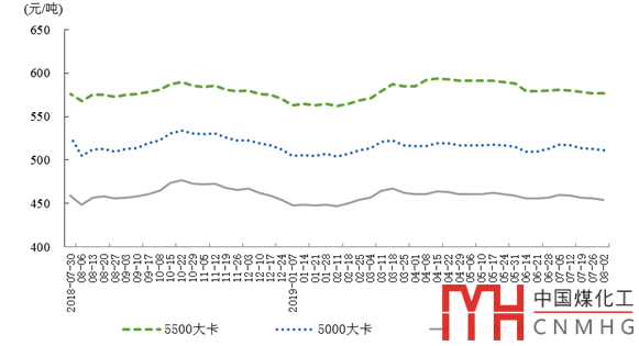 截至8月2日,秦皇島5500大卡煤炭綜合交易價格為每噸577元,5000大卡為每噸511元,4500大卡為每噸454元,比6月28日分別回落3元、2元和3元。