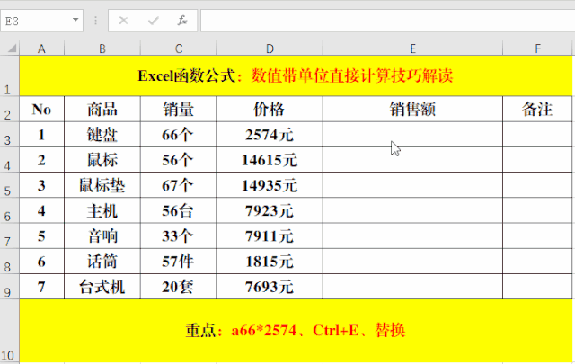 二、數值帶單位計算:Ctrl+E法。