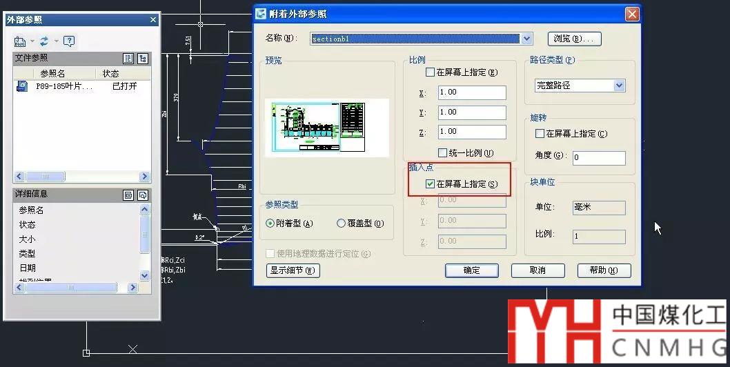 這個對話框的參數(shù)跟插入圖塊很像,也有比例、插入點、旋轉(zhuǎn)角度、單位的設(shè)置,只是多了參照類型和路徑設(shè)置,這個我們暫且不管,確認(rèn)插入點勾選了在屏幕上指定選項。