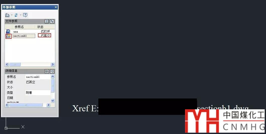 我們在圖中看不到之前插入的圖紙B了,在外部參照管理器里顯示B圖紙已孤立,我們可以放大觀察外部參照的插入點,會發(fā)現(xiàn)這里會顯示XREF加上文件名。