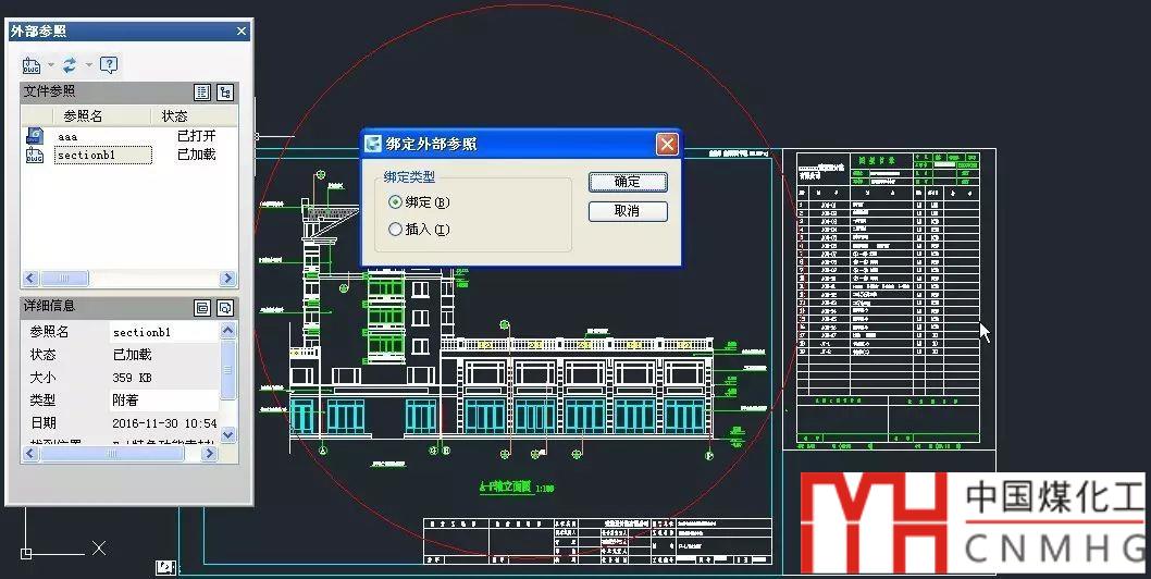 在外部參照管理器的圖紙名上右鍵單擊,在右鍵菜單中選擇綁定,就可以將外部參照綁定到當(dāng)前圖中,稱為一個圖塊,如下圖所示。