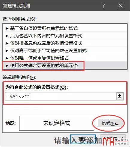 在新建格式規(guī)則中,選擇使用公式來確定,然后輸入的公式是:=$A1<>""
