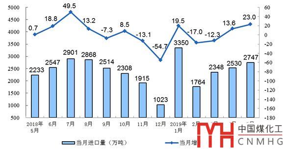 5月份,進(jìn)口煤炭2747萬噸,同比增長23.0%,比上月增加217萬噸;1~5月份累計(jì)進(jìn)口煤炭12739萬噸,同比增長5.6%。