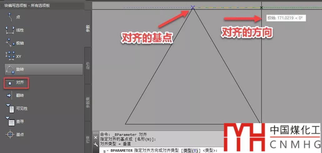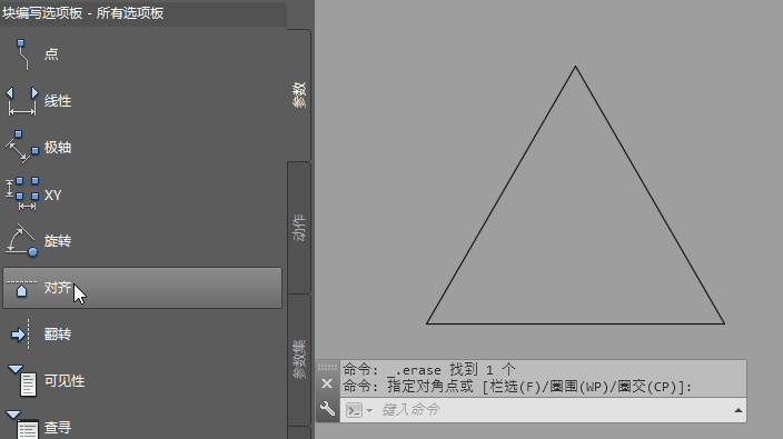 我們簡單畫一個三角形圖塊看一下對齊參數(shù)如何設置,雙擊圖塊進入塊編輯器后,單擊對齊參數(shù),將對齊基點設置在三角形的頂點處,通常也是圖塊插入點的位置,然后根據(jù)提示拉動光標確定對齊的方向,如下圖所示。