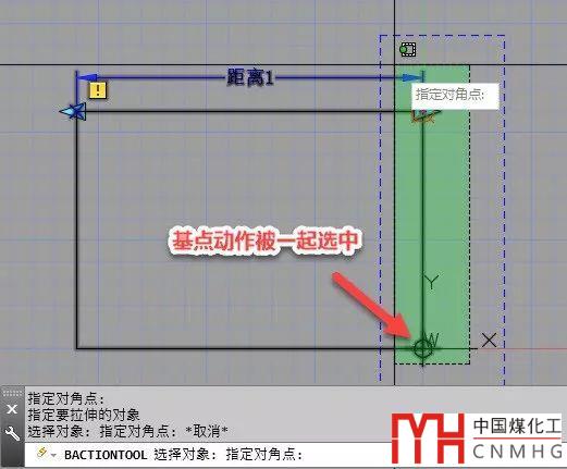 雖然基點可以獨立使用,不必與動作關聯(lián),但設置動作的時候可以將基點和其他圖形一起選中,讓插入點跟隨動作進行調(diào)整。比如設置拉伸動作的時候?qū)⒒c與線性參數(shù)和圖形一起選中,如下圖所示。