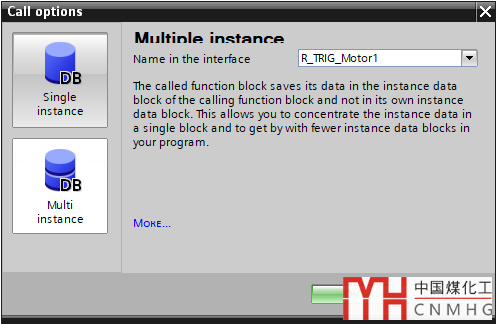 向FB中添加上升沿觸發(fā)指令:R_TRIG ,在出現添加背景數據塊對話框中選擇“多重背景數據”,并命名為:R_TRIG_Motor1,如下圖: