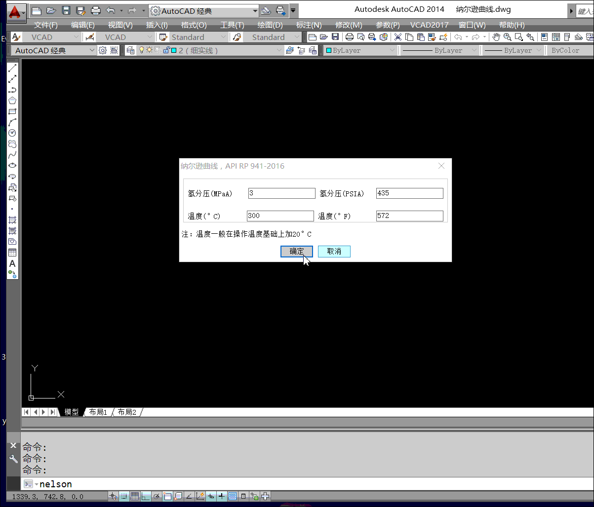 將上面繪制的納爾遜圖存成圖塊,編寫查詢對(duì)話框,通過輸入橫坐標(biāo)氫分壓,縱坐標(biāo)溫度,然后調(diào)用圖塊。在圖塊上繪制氫分壓和溫度的直線,相交的地方就是材料需選擇的依據(jù)。