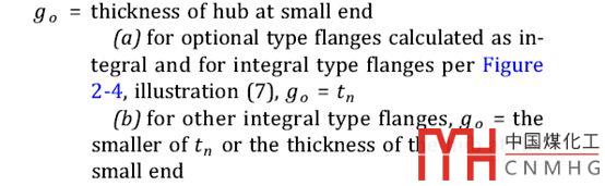 第三種情況,如果僅按GB/T150.3的第7部分(即ASME VIII-1的MandatoryAppendix 2),進(jìn)行非標(biāo)法蘭設(shè)計(jì)。g0應(yīng)為法蘭小端厚度δ1和對(duì)接筒體或接管壁厚δ0的較小值,即g0=min(δ1,δ0)。