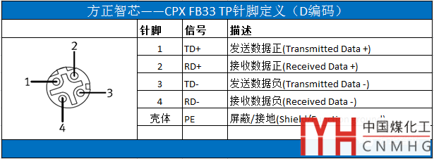 FB33提供兩個Profinet的網(wǎng)絡(luò)接口:TP1和TP2。兩個接口插座的尺寸為M12,采用D編碼,各針腳的定義如下圖: