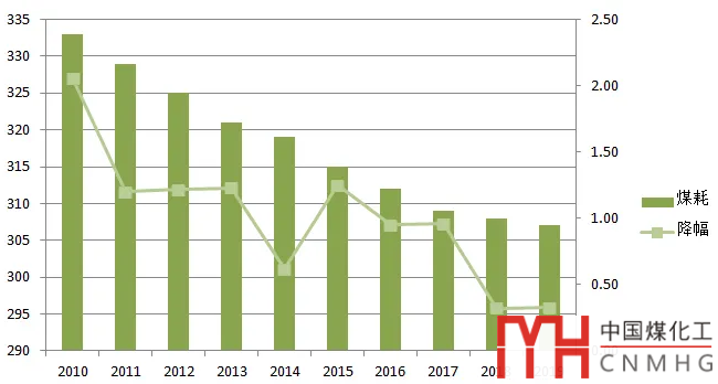 圖5-13 2010~2019年供電煤耗和降幅(單位:克/千瓦時(shí),%)