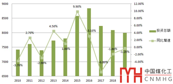 圖5-15 2010~2019年全國電力投資總量及增速情況(單位:億元,%)