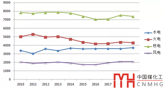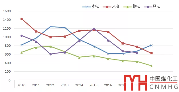圖5-18 2010~2019年水電、火電、核電、風(fēng)電投資情況(單位:億元)