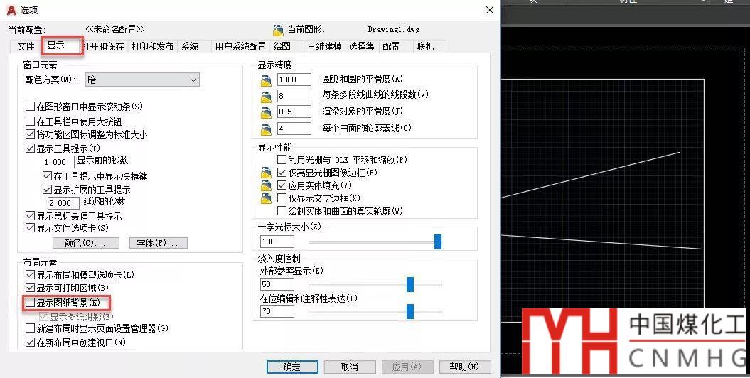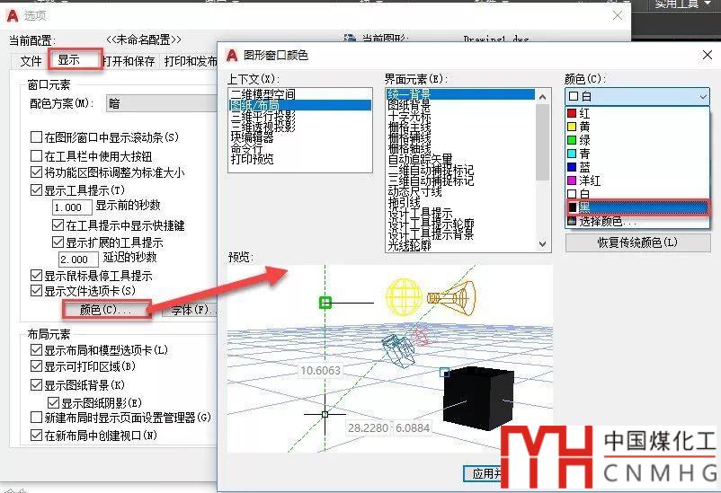 上圖中白色部分表示虛擬的紙張,后面灰色的是圖紙背景。要想把圖紙背景改成黑色,只能是線將紙張背景改成黑色,如下圖所示。