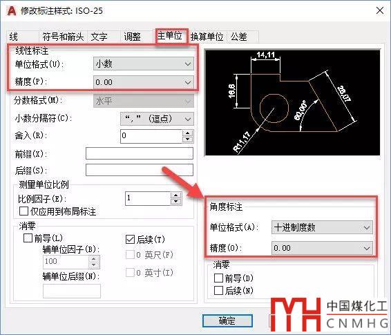 CAD界面中角度的顯示精度在單位UN對(duì)話框設(shè)置,而長度和角度標(biāo)注的精度都在標(biāo)注樣式里設(shè)置,如下圖所示。