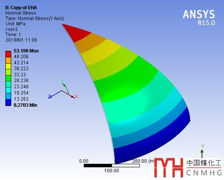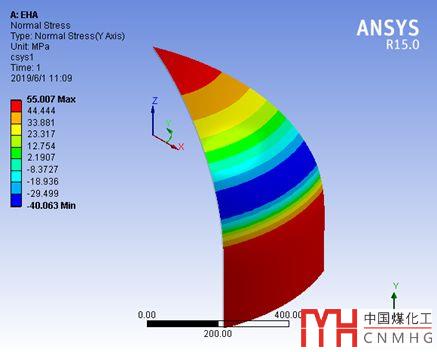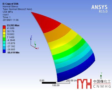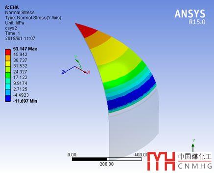 我們提取的是封頭外表面,圓柱坐標y方向(即周向)上的normal stress,即周向應力,封頭中心為拉應力53MPa,赤道處為壓縮應力50MPa。