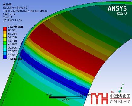 最后,我們來看一下模型的米塞斯Mises應力分布,即第四強度理論的當量應力。多數(shù)塑性材料進行應力分析時,采用這個當量應力進行強度校核的。當然,GB/T 150屬于常規(guī)設計,用的不是這個設計準則。