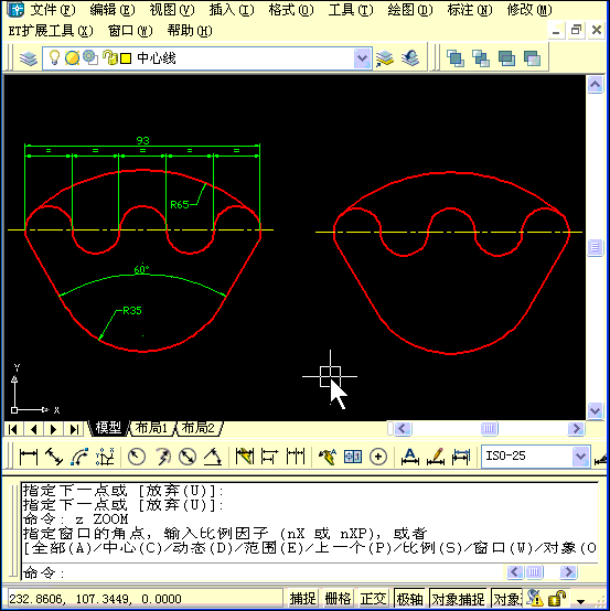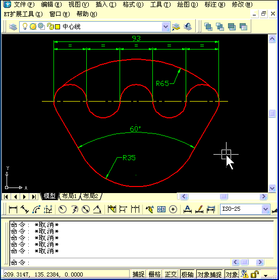 這張圖條件倒比較充分,關(guān)鍵是從哪里下手。現(xiàn)在看起來條件最充分的是中間的五個半圓,他們的直徑加起來是93,CAD支持分?jǐn)?shù)輸入,可以輸入93/5作為直徑,也可以輸入9.3作為半徑。畫完后,上面的圓弧用相切相切半徑可以畫出來,下面的夾角呈60的兩條切線麻煩一點,畫出這兩條線,延伸上面的圓,用相切 相切半徑畫出下面的圓就好了。