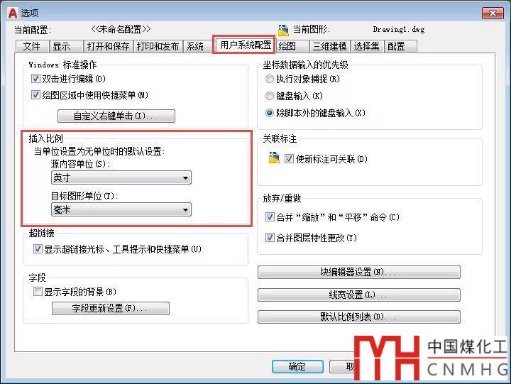 由于不同國家、不同行業(yè)有約定俗成的標準和習慣,大家通常都用相同的單位,比如國內的建筑行業(yè)都用毫米作為繪圖單位,因此大多數(shù)情況下這個單位設不設置都沒有關系。即使遇到需要轉換單位的圖紙,我們也可以在插入前設置單位,也可以在選項對話框直接源內容單位和目標圖形單位,如下圖所示: