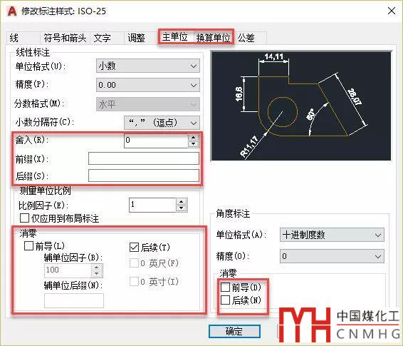 標注樣式中有更多的單位設置選項,有主單位,還有換算單位,主單位選項卡中DE CAN也比單位設置對話框要多。標注樣式中的單位設置主要用來控制標注尺寸值的顯示效果,在設置格式和精度的基礎上還可以設置舍入精度、前后綴以及如何消零等等,如下圖所示。