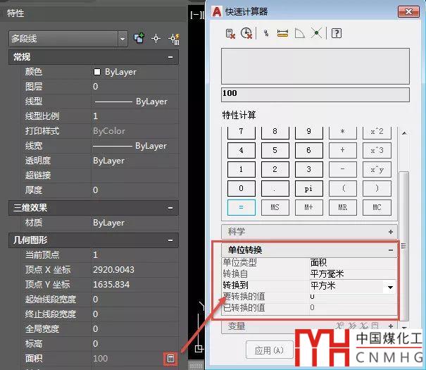 有時我們按毫米來畫圖,但有時卻需要按照米或其他單位來統(tǒng)計尺寸和面積,這就涉及到單位轉換,CAD的快速計算器就可以進行單位轉換,在特性面板(CTRL+1)中的參數(shù)后點計算器按鈕,可以很方便地調用計算器并進行單位轉換。