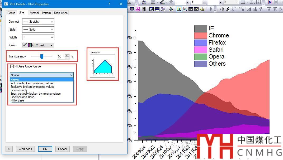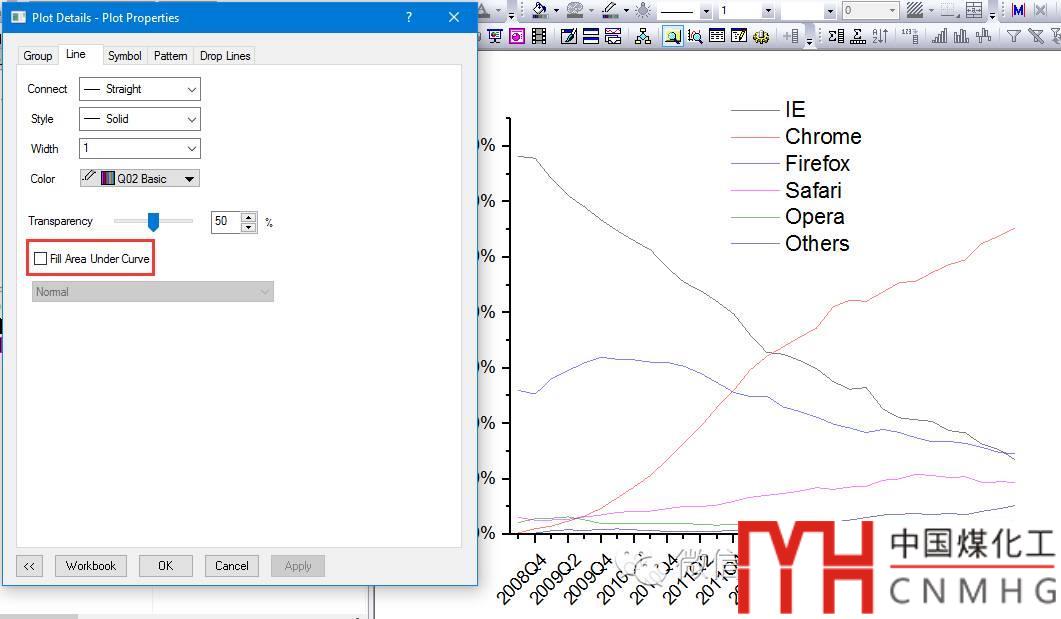 查看其Line屬性卡,Fill Area圖的Fill Area Under Curve選項(xiàng)為Fill to next data - One Color,因此填充色僅有一種顏色