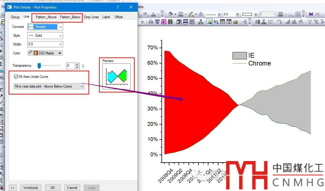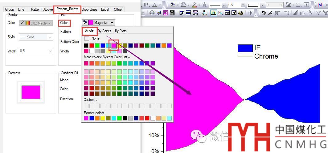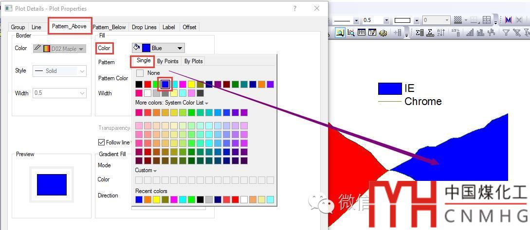 如果改為Fill to next data - Above Bellow Colors,則可以設(shè)置Pattern Above和Pattern Bellow的顏色,更好地區(qū)分填充區(qū)域的意義