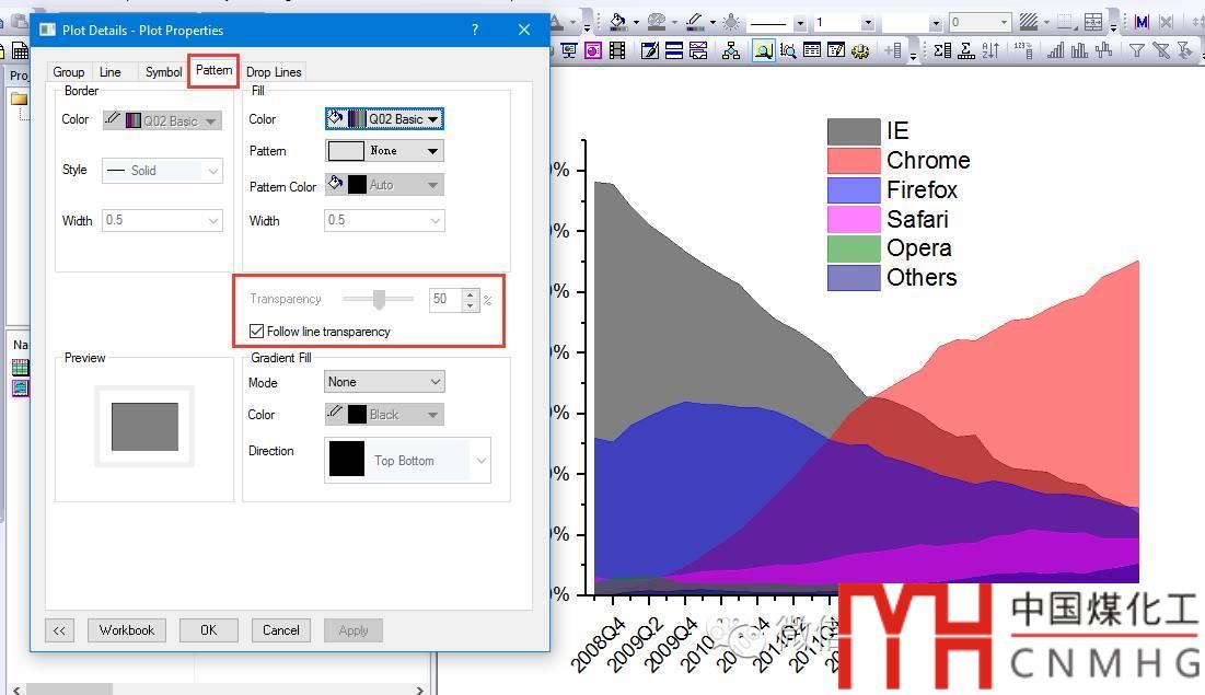 心細(xì)如發(fā)的你會(huì)發(fā)現(xiàn):為什么在上一步中只是調(diào)整了Line的透明度,但是填充色的透明度也變化了呢?因?yàn)樵?em>Pattern選項(xiàng)下,勾選了Follow Line Transparency,其透明度是和Line的透明度相關(guān)聯(lián)的。