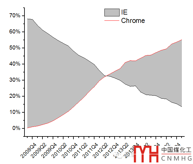 Fill Area圖很有意思,和Floating Column有點(diǎn)類似,但比Floating Column更容易理解。其紅色線條表示Chrome的市場份額變化,而灰色線條表示IE的市場份額變化,中間的面積為二者的市場份額差值。
